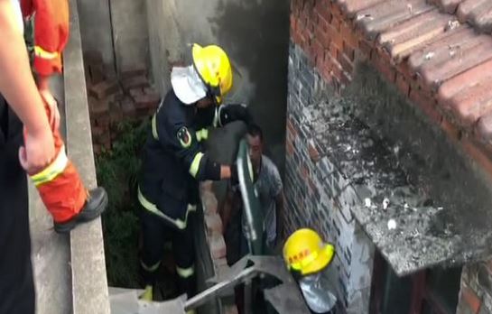 老人摔落至两墙中间,头部流出鲜血,救援人员到场后,立即使用担架将老人固定,合力将老人抬到了另一间房子的平台处。