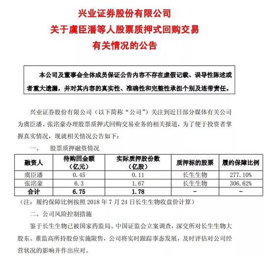 兴业证券7月24日晚公告称,将评估长生生物大股东、董监高股份限售对公司的影响。公告指出,融资人虞臣潘、张洺豪实际质押长生生物股份数为1.78亿股,其中张洺豪质押1.67亿股。鉴于深交所对长生生物大股东、董监高所持股份实施限售,公司将实时跟踪事态发展,及时评估对公司经营状况的影响并作出应对。