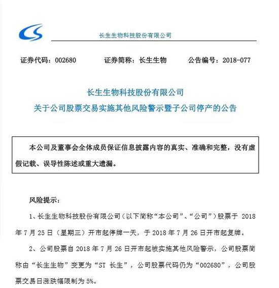 昨晚,长生生物发布公告称,公司股票于7月25日停牌一天,26日复牌。自7月26日起被实施其他风险警示,股票简称变更为“ST长生”,公司股票交易日涨跌幅限制为5%。此外,长生生物董事长等15人,已被长春新区公安分局依法刑拘。