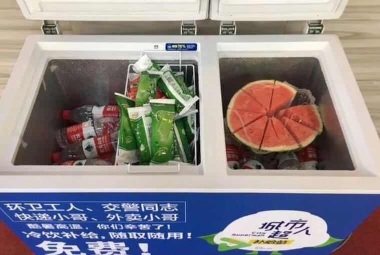 江苏城市频道在南京市双龙巷的一家苏果便利店门口,摆放了一台“爱心冰柜”,这也是今夏南京城里出现的第一台“爱心冰柜”。江苏城市频道制片人李俊杰表示,现在在街头提供一个有免费冷饮的冰柜,已经成为公益圈里的一个潮流。