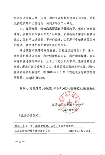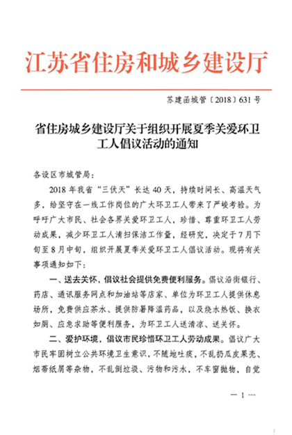 江苏省住房和城乡建设厅今天(7月31日)向全省13个设区市城管局发出通知,倡议各地组织开展夏季关爱环卫工人活动。