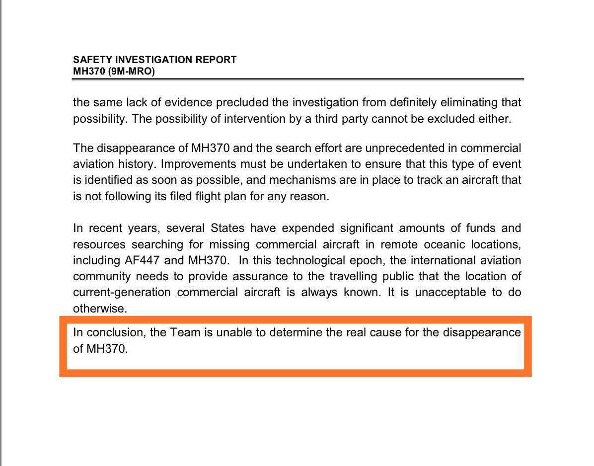 报告翻译:“总之,(调查)小组无法确认导致MH370航班失踪的真实原因。”