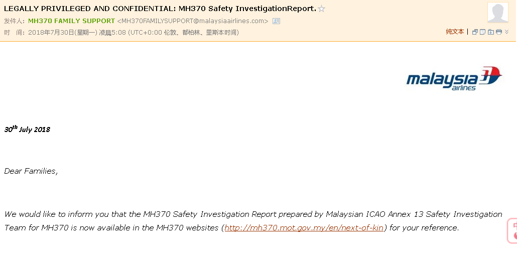 事发后,独子王某和家人悲痛万分,他们一直拒绝接受任何赔偿,期待失联案情的水落石出。而这一次,王某又一次失望。他告诉荔枝新闻记者,昨天下午,他在邮箱收到了马航寄来的这份调查报告,四百多页的PDF报告全是英文,他根本不知道到底说了是什么信息,直到看了新闻报道才知道发生了什么。