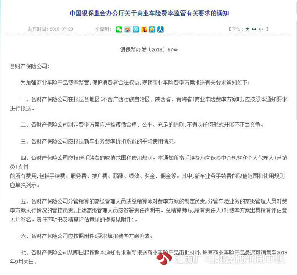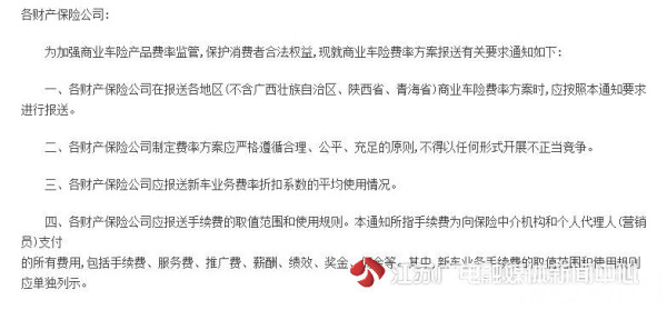 近日,银保监会在官网发布了《中国银保监会办公厅关于商业车险费率监管有关要求的通知》,通知中明确规定:各财产保险公司要向银保监会报送各自的商业车险费率、手续费的取值范围,而且要做到报行合一。江苏省保险行业协会工作人员给我们打了个比方,如果手续费报送30%,就要按照30%执行,没有对手续费的额度做统一要求。不过,如果保险公司实际操作和报送的相差较大,银保监会可能会进行一定的处罚。