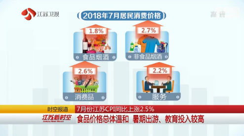 从环比数据看,7月份,江苏八大类商品及服务价格环比"七涨一跌"。暑假期间,各类教辅书,以及各类辅导班、培训班较多,数据显示,江苏的居民教育文化和娱乐上涨1.4%,涨幅最高。虽然猪肉价格与去年相比有所下跌,但比6月上涨3.2%,意味着近期猪肉价格有所反弹。