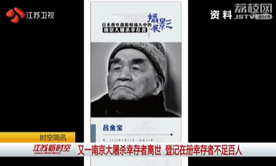 今晨6点26分,南京大屠杀幸存者吕金宝去世,终年94岁。吕金宝老人1924年4月12日出生,日军轰炸时,头部被炸伤,因为医疗条件差没能取出残留的弹片,导致双目失明。截至目前,南京大屠杀登记在册的幸存者已不足百人。(江苏广电融媒体新闻中心记者/沈杨)