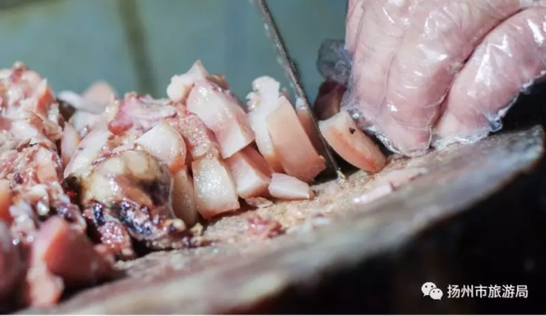 在湾头镇老万福大桥桥西朝南的门面房靠墙边的位置,挂着白底红字的招牌“万福闸猪头肉”,看起来像上世纪八九十年代的厂牌;店里有“万龙熟食”字样,这其实是万福闸猪头肉的本名,“万龙”就是老板的名字。因为很多人记不住这里叫万龙熟食,但是记得在万福闸附近,朱万龙就做了个“万福闸猪头肉”的招牌挂在门口。老扬州都知道,他家的猪头肉软糯黏唇,供不应求,去晚了就没有了。