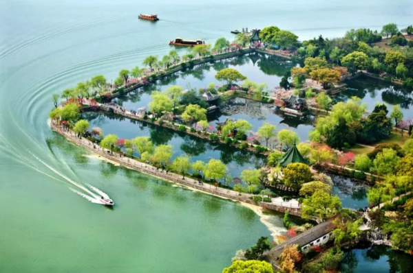 蠡湖,原名五里湖,是太湖东北处的一个内湖,伸入蠡湖的蠡园是无锡的老牌公园,具有江南园林风格,以水景见长,细细窄窄的长提、小桥、长廊架于水上,春有桃花,夏有荷,宛如一座水上花园。