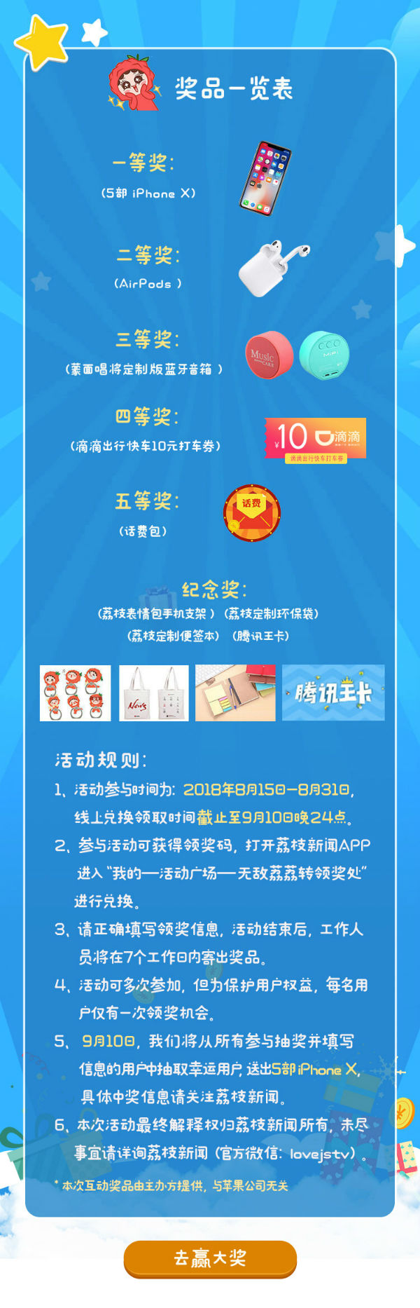 在生日到来之际,荔枝新闻化“感激之情”为“周年大礼”,8月15日至8月31日,登录荔枝新闻客户端,点击荔枝新闻五周年福利礼包——“无敌荔荔转”,就有机会获得AirPods、定制版蓝牙音箱、联通无限流量“大王”卡、滴滴专车打车券以及话费包等精美礼品!悄悄说,荔枝新闻还准备了“超级福利”,凡是参与活动的盆友们都有机会抽取iPhone X!周年大庆,奖品多多,5台iPhone X等你来抽取!