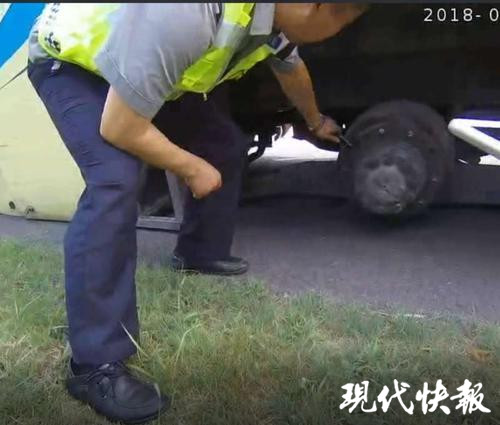 事情还得从头说起,7月27日15点40分,南京交警高速六大队民警巡逻发现,一辆安徽牌照大客车在宁杭高速往南京方向抛锚,民警询问得知,该车右后轮竟不翼而飞。此后,在民警的帮助下,分别在对面车道和路边草丛里找到了这两只轮胎。驾驶员马某交代,车辆在高速正常行驶过程中,突然右后轮两个轮胎飞了出去,车辆差点失控翻车。