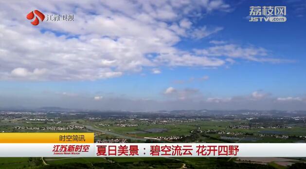 台风为我省多地吹来蓝天白云的"水晶天"。在镇江句容赤山山顶,放眼远眺,大朵白云飘过,田野阡陌纵横,和宽广的赤山湖面交相映衬,共同构成一幅美丽画卷。蓝天之下,绽放的群花也装扮着大地。宿迁沭阳的千亩荷池里,绿叶田田、花开如玉。鲜嫩的莲蓬跃出水面,一派勃勃生机。在常州市紫荆公园内,数千平方米的柳叶马鞭草、牡荆等花朵相继绽放。(常州台 句容台 沭阳台/报道 徐晗/编辑)