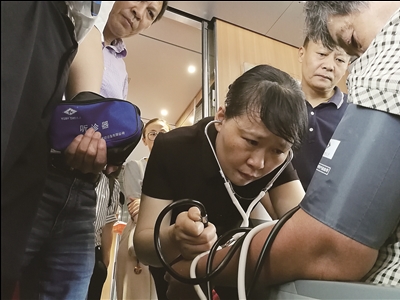 南通大学附属医院心内科主任医师盛红专博士、神经外科主任医师周非、神经内科主任医师曹茂红、急诊内科主任医师唐建忠仔细询问。盛主任让列车员拿来听诊器,仔细听诊,测血150/70mmhg,确认心脏没有特别的大问题,周非主任查看了列车上的药箱,没有找到合适的药物,曹茂红主任为冯奶奶做了体格检查,唐建忠主任一边和大家一起讨论一边给予老人安慰。团委副书记葛媛璟拿来了自己备用的芬必得药片,主任们商量后,先让冯奶奶服下芬必得止痛,如果再有不适,随时通知,并告知列车工作人员,我们有强大的专家团。
