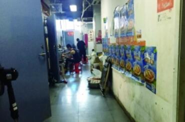 每家的炒锅边是四散的剩菜,水池旁、墙面上油污严重,几乎每一家都能挑出点儿毛病。在这里,筷子成为摆设,抓菜全靠手,有商家将放有蔬菜的塑料篮子直接摞在一篮炒熟的鸡块上,脏兮兮的篮子底部与鸡肉亲密接触,炒菜的男子直接用手往勺子里扒鸡块。还有商家的工作人员不戴手套,直接手抓一把黄瓜丝放入拌饭中,他家对面黑屋子里的水池堆满了化冻鸡块,不断往下滴着水;透过出餐口,能看见一家主打双拼饭的工作人员手抓熟鸡柳装盒。最让人难以忍受的是三楼走道尽头的龙虾店,就开在公共厕所旁,一盆龙虾和厕所大门相距不过几米。