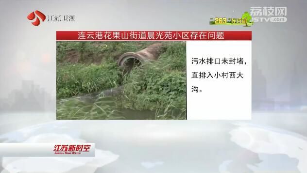 江苏台记者高涵:“在晨光苑小区的外围,我们看到一个排污管道,里面正有污水排出,根据我们的了解,这个小区在建成之初就没有接管,生活污水长期直排进旁边的小河。”