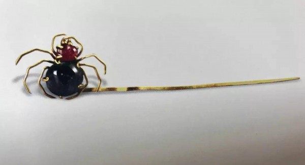 明代金饰在制作中大量采用宝石镶嵌技术,如蜘蛛形金簪,用金丝将红蓝宝石编织成蜘蛛的形状。