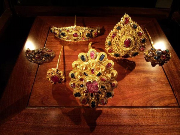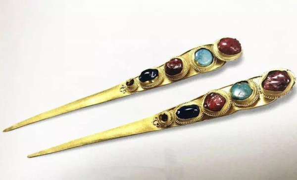 明成化十年(1474年)沐斌妾梅氏墓的一组金簪,是明代贵族妇女使用的一幅完整的头面,包括挑心、掩鬓、顶簪、分心等,均镶嵌大量红宝石、蓝宝石及绿松石、猫睛石等,虽出土时有的宝石已缺,但嵌宝石的金托多达97个,极为罕见。