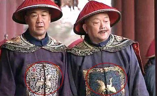 公、侯、驸马、伯的补子绣麒麟;文官一品绣仙鹤,二品绣锦鸡,三品绣孔雀,四品绣云雁,五品绣白鹇,六品绣鹭鸶,七品绣鸂鶒;