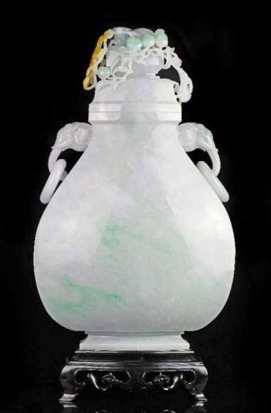 “一个玉中同时有三种颜色,可以说比较少见。三彩翡翠有非常多明艳的色彩,设计困难特别大,以三彩翡翠作为主题产品,选择题材、立意、内容、构图、镌刻与抛光等都很讲究,要有丰厚的文化和美感底蕴,才能够形成独有的美感,达到‘琢石为玉、点石成金’的水平。”闫鹏解释,这件三彩翡翠“福禄寿瓶”可谓天工造化,匠心精创。巨大的器身为一块完整的翡翠原石,瓶身如同一枚硕大的寿桃,饱满丰盈,遍体绿翠冰底,淡雅的紫罗兰色素裹全身,高贵迷人,瓶盖更是以黄翡巧雕五只蝙蝠团团飞舞,寓意五福盘寿,翠玉雕琢的一只梅花鹿,扣衔桃枝,桃枝上硕果累累,谐音有“福禄”之意,蟠桃益寿,与“黄翡、绿翠、紫彩”的玉体“福禄寿”意义暗合,设计可谓绝妙。整件作品透出一股雍容大气,堂皇富丽,是一件艺术价值和收藏价值都很高的玉器珍品。