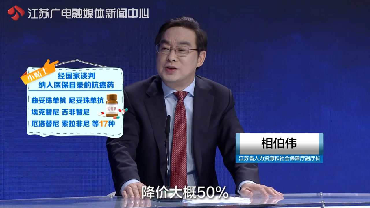江苏省人力资源与社会保障厅副厅长相伯伟表示,从2016年开始,国家相关部门已组织在全国层面开展了药品价格和有关医保目录的谈判,大概有39个价格相当昂贵的药品谈判进入了医保目录,其中抗肿瘤药就有17种,平均降价就是通过谈判进入医保目录降价大概50%。江苏在国家的基础上增加了292种。