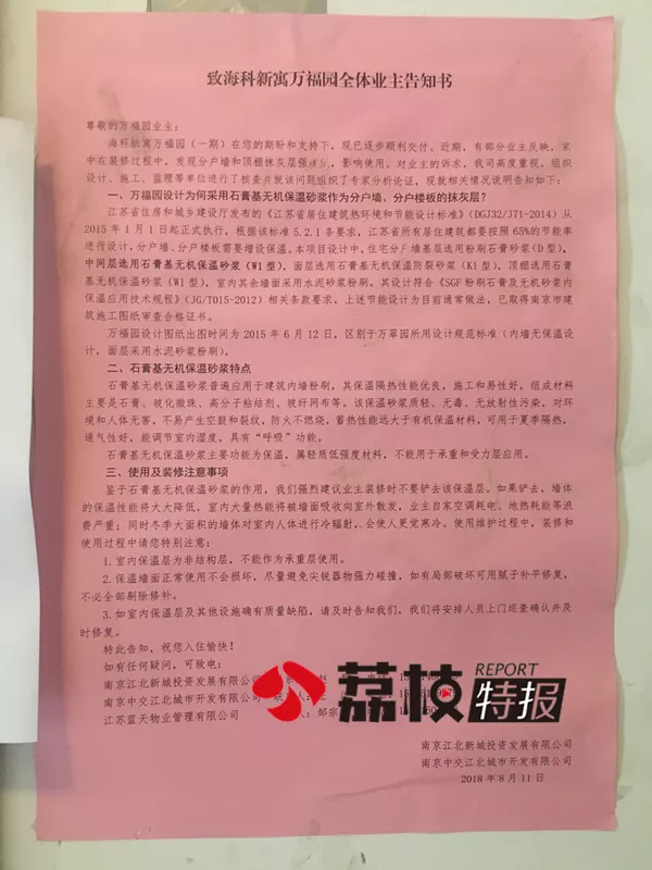 据悉,海科新寓万福园小区有八百多户业主,目前都面临相同的问题。记者在走访中还发现,所有楼栋的电梯间里都张贴了一份由南京江北新城投资发展有限公司和南京中交江北城市开发有限公司联合署名的“致海科新寓万福园全体业主告知书”。