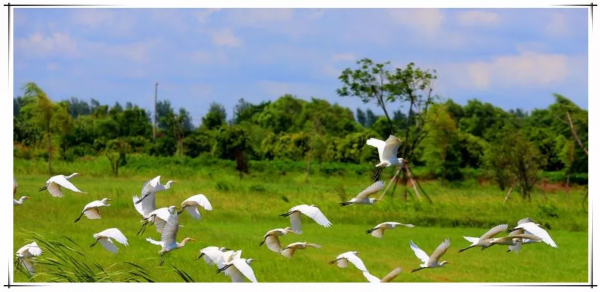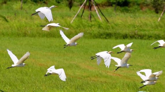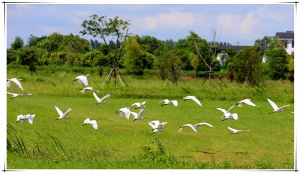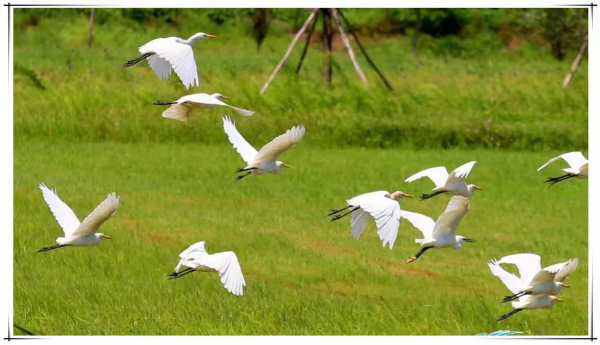 18日在开沙岛拍摄的绿草丛中的白鹭。开沙岛动植物资源丰富,野生水禽鸟类达30余种。