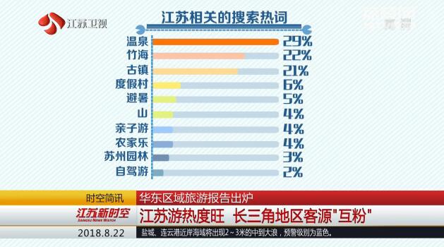 由中国旅游研究院等近日发布的华东区域旅游报告显示,2017年华东各省、市、地区的旅游业均保持较高增长速度,江苏旅游热度涨幅排名位居第二。其中,古镇、温泉、竹海是江苏旅游热度较高的关键词。大数据显示,"烟花三月下扬州",农历三月正值春季4月、5月,是江苏一年中最佳的旅游时间,也是全年出游高峰。旅游客源地方面,长三角地区"互粉"的特征尤其显著。除北京天津外,上海的最大客源地为江浙两省,江苏的最大客源地为上海,浙江的最大客源地为江苏,相互输送了不少周边游游客。(江苏广电融媒体新闻中心记者/毕然)