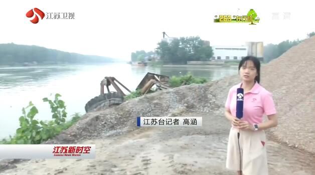 江苏台记者高涵:“最让我们惊讶的是,这个砂石堆紧邻着通榆河和黄沙港的交界处,一旦下雨的话,雨水就会混着污水直接流入到河流中去。”