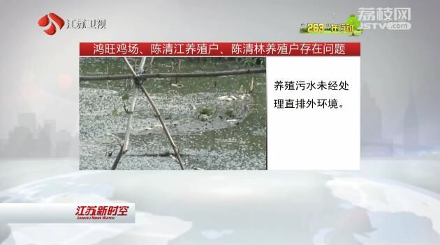 江苏台记者高涵:“这家养殖场旁边就是一个小沟塘,养殖场的污水也没有处理措施,直接排放到河流中,附近散发着一股粪便发酵的味道,十分的恶臭难闻。”