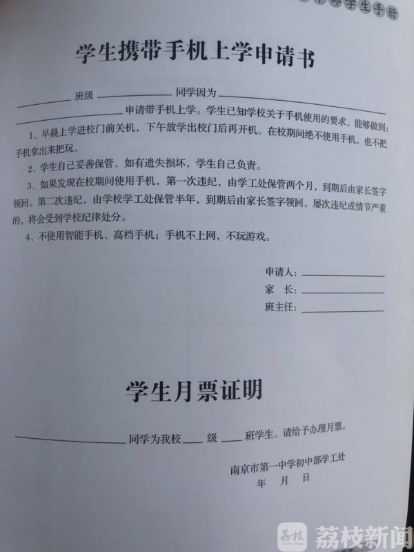 记者注意到,在学校发的《南京一中初中部学生手册》中就有“学生携带手机上学申请书”,学生可以提出申请携带手机,不过早上上学进校门前要关机,在校期间绝不使用等要求。