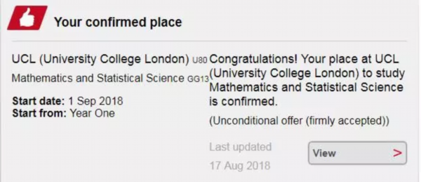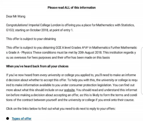 “在老师指导下,申请了上面的5所大学,都过了!”今年8月中旬,成绩出啦,A*A*A!棒棒哒!很快,伦敦大学学院的数学与统计专业向他抛来了橄榄枝,邀请他于今年9月24日赴该校就读。