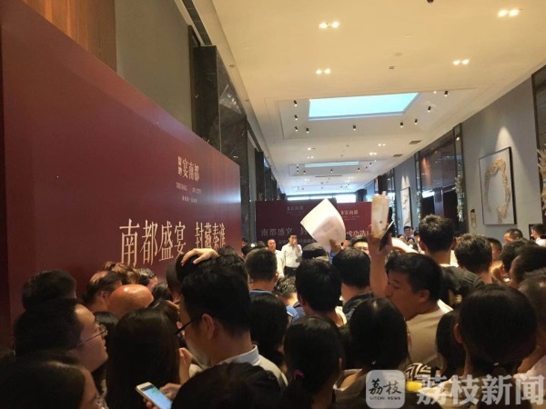 今天上午,记者来到了位于南站附近的复地宴南都项目的销售中心,售楼处里有不少是参加昨晚开盘活动的意向买房人,还有昨天就从盐城赶来,着急询问置业顾问重新开盘时间的买房人。意向买房人告诉记者,原本昨晚6点,应该是前500号的意向购房人签到后进场选房,可不知道为何,摇号在500号之后的意向购房人也接到通知赶来了,近千人的开盘现场把窄小的签到通道堵得水泄不通,原定于晚上7点的选房被一拖再拖,直到晚上7点半左右,开盘活动把警方吸引来了,现场被即刻叫停。