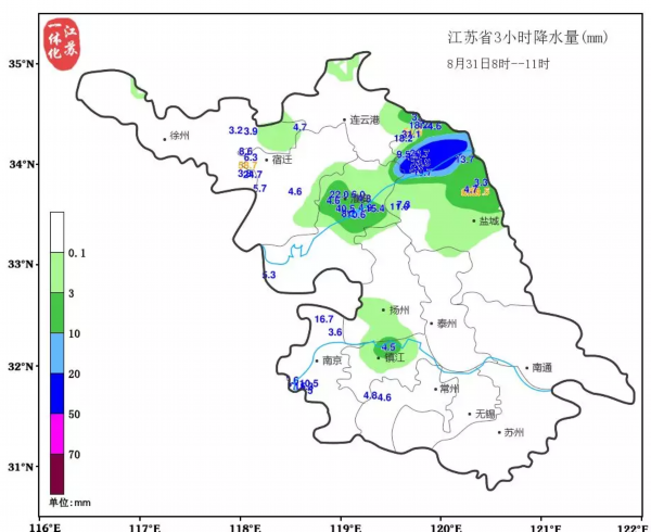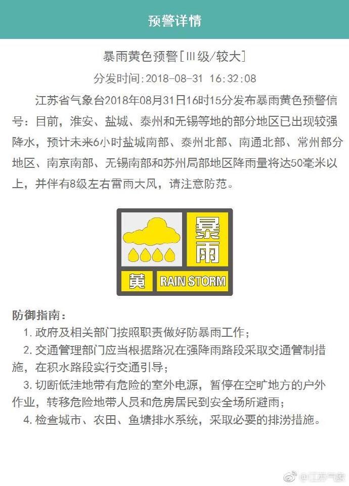 我苏网讯 江苏省气象台2018年08月31日16时15分发布暴雨黄色预警信号:目前,淮安、盐城、泰州和无锡等地的部分地区已出现较强降水,预计未来6小时盐城南部、泰州北部、南通北部、常州部分地区、南京南部、无锡南部和苏州局部地区降雨量将达50毫米以上,并伴有8级左右雷雨大风,请注意防范。