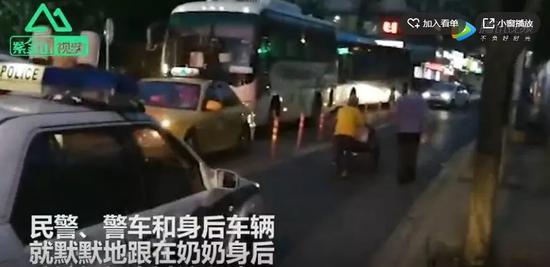 民警、警车和身后车辆就默默地跟在老奶奶身后,陪她慢慢走过这段路。