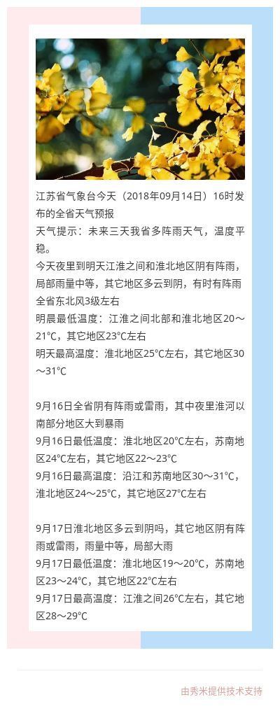 同时,受台风“山竹”影响,未来三天江苏也进入多雨模式。中央气象台预报,“山竹”预计将于15日凌晨登陆或擦过菲律宾吕宋岛北部沿海,随后入海,并可能于16日晚上到17日凌晨在广东阳江到海南文昌一带沿海登陆。受台风影响,华南地区将遭遇狂风暴雨。对比来看,江苏只是受台风外围影响,风雨也相对小些。需要提醒大家的是,下周一早高峰可能会受到风雨影响,请提前做好准备。