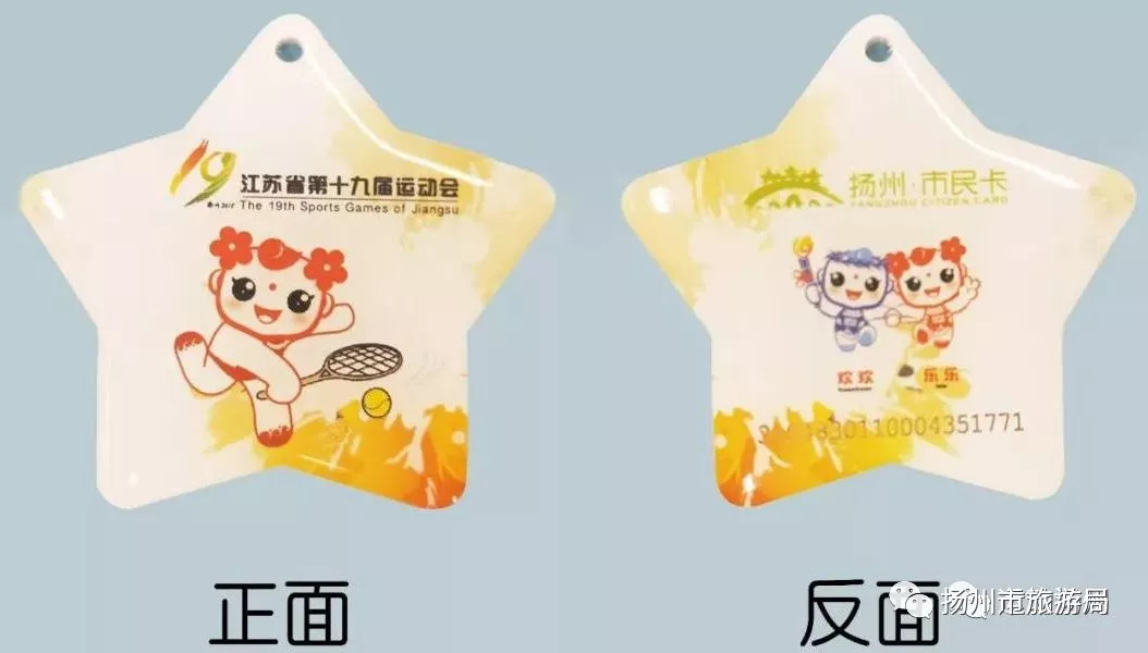异形卡与普通卡相比,则小了许多。其第一种造型为“五星造型”,正面图案是手拿球拍打球的“乐乐”,同时有“江苏省第十九届运动会”的中英文对照文字,背面的图案是手挽手的“欢欢”和“乐乐”,同时有扬州市民卡的标识;第二种造型为方形,正面是游泳的“乐乐”,同时有“19”和“江苏省第十九届运动会”的中英文对照文字,背面的图案同样是手挽手的“欢欢”和“乐乐”,同时有扬州市民卡的标识。市民可在市民卡公司各营业厅购买。
