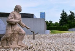 偌大的墓地广场,满眼鹅卵石,寸草不生,象征着累累白骨和死亡,而两边翠绿的草坪和院墙外的常青树象征着生命力和抗争精神,生与死形成对比。