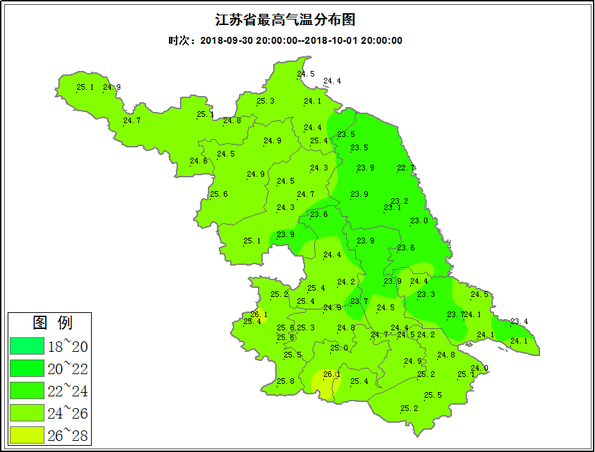 10月4日最高温度:本省东部地区24℃左右,其它地区25~26℃