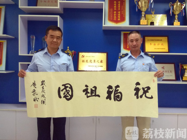 我苏网讯 国庆69周年当天,扬子公交浦口公司夜班车司机胡敬状饱含深情用毛笔写下一副代表他心声的字:祝福祖国!