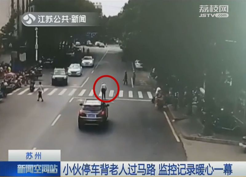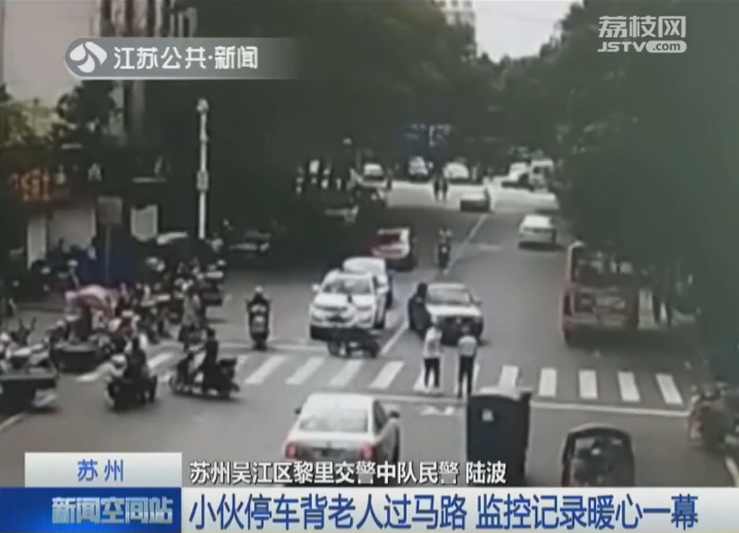 前几天,苏州吴江街头发生了非常暖心的一幕:一位小伙子背起在斑马线上蹒跚而行的老人,帮他安全穿过了马路。