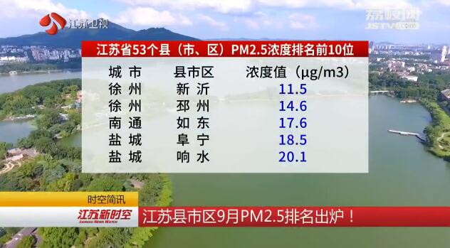 省环保厅10月8日公布9月份全省53个县(市、区)PM2.5浓度排名情况。新沂、邳州、如东、阜宁、响水等地排名前10,泰兴、江阴、靖江、句容、东海等地排名后10位。后10名县(市、区)集中在沿江经济带,主要与产业结构偏重有关。(江苏广电融媒体新闻中心记者/陈超)