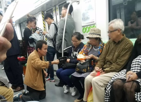 该网友说,男子一路跪地拖行,并逐个向车厢内的乘客进行乞讨,不少乘客表示没有零钱,该男子却仍然不依不饶的跪在面前,“有几个看着好说话的女生,他还指着她们的包要求她们在包里找找。”但是在跪行到下一个车厢时,一位苏州阿姨看不下去了,并对着向她乞讨的男子说:“你这样太有损苏州形象了,啊给苏州人丢脸啊!”