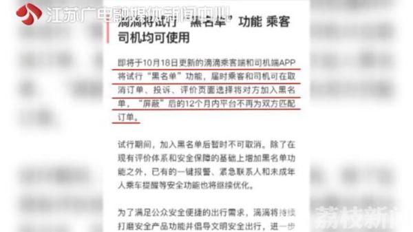 滴滴出行发布公告称,10月18日将更新的滴滴乘客端和司机端App试行“黑名单”功能,届时乘客和司机可在取消订单、投诉、评价页面选择将对方加入黑名单,“屏蔽”后的12个月内平台不再为双方匹配订单。