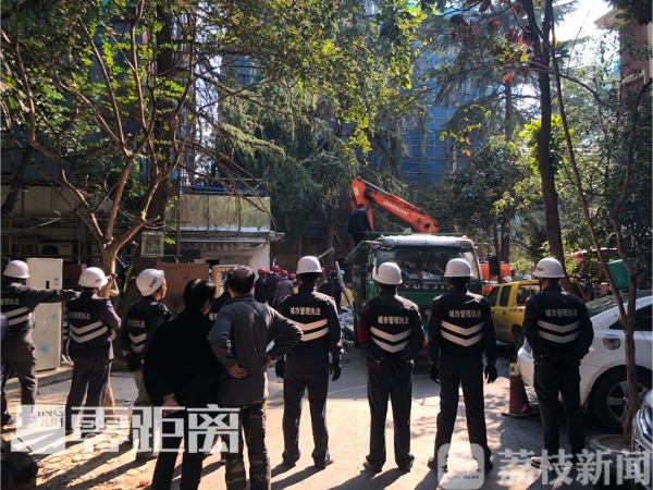 近日,南京雨花新村小区三村正在全面出新,但出新工程却因一栋违建影响了进度,一楼院落违建使得工人无法搭建脚手架施工。在违建户不愿主动配合的情况下,城管部门组织人员对这处违建实施了拆除。