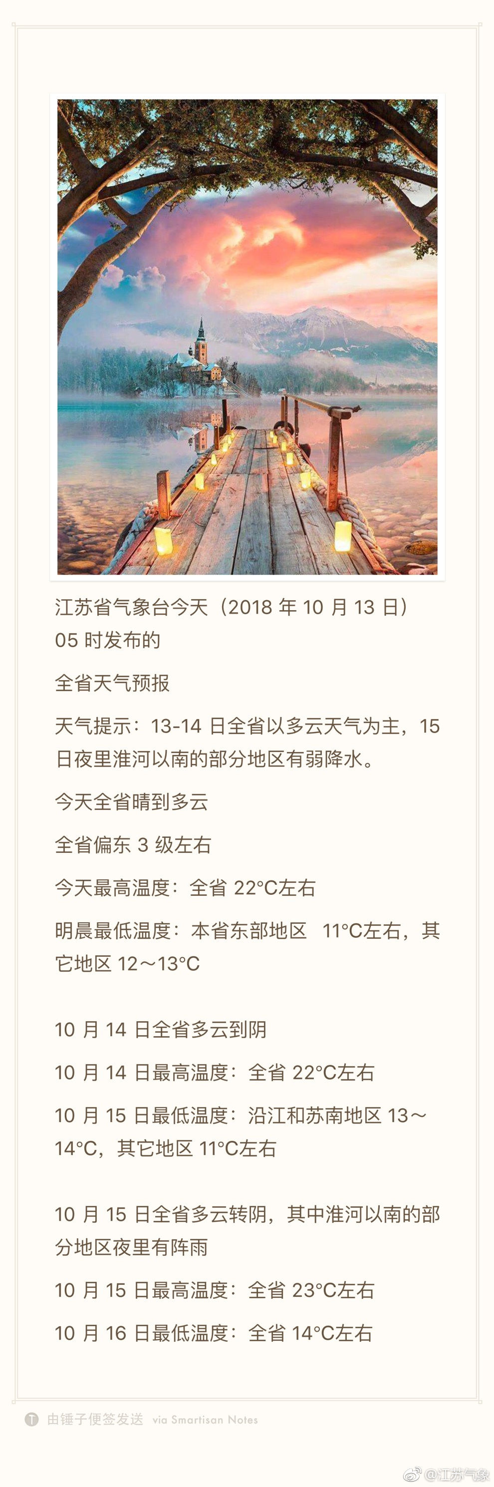 根据江苏气象今晨5时发布的最新消息:13-14日全省以多云天气为主,15日夜里淮河以南的部分地区有弱降水。今天全省晴到多云,全省偏东3级左右。