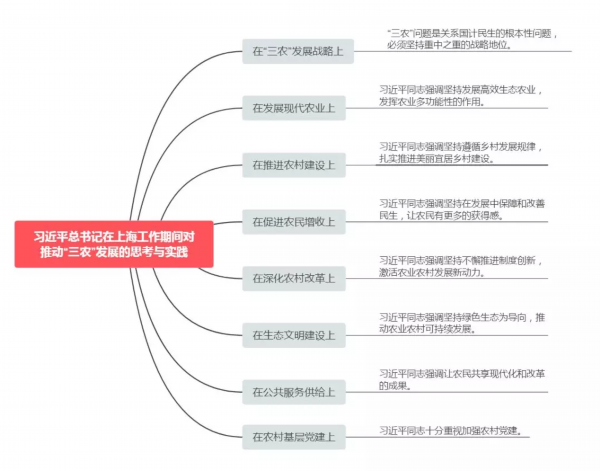 一、在“三农”发展战略上,习近平同志在不同时间、不同场合强调,“三农”问题是关系国计民生的根本性问题,必须坚持重中之重的战略地位。他指出,“破除二元结构,就是要把农村抓好,新农村建设这个战略任务,一定要在上海得到体现,不能说我们是国际化大都市,就轻农,就忽视农业,忽视‘三农’”,“投入上向‘三农’的倾斜力度要更加大一点,公共财政支出向‘三农’多拨一些”(2007年8月9日在南汇区调研时的讲话)。他指出,“城市与农村、农业与二三产业之间有着非常紧密的依存关系,正确处理城乡关系、工农关系,实现一二三产业协调发展和城乡共同进步,是推动科学发展、促进社会和谐的重要基础”(2007年9月27日在上海市农村党的建设“三级联创”活动工作会议上的讲话)。他指出,上海“具备了全面实现城乡一体化的条件。城乡一体化并不是一样化、一律化、无差别化,还是有差别的,城还是城,乡还是乡,风貌还是不一样的”(2007年8月29日在奉贤区调研时的讲话)。习近平同志在上海市委八届十二次全会结束时的讲话中指出,上海作为特大型城市,虽然农业比重非常小,不到1%,但只要有农业、农村、农民,就要把“三农”工作作为重中之重来抓。这些重要论断,科学回答了如何看待“三农”、对待“三农”、抓好“三农”的问题,全面阐述了解决好“三农”问题在现代化全局和长远发展中的根本地位,把解决“三农”问题的重要性提升到了历史新高度,为上海推进“三农”工作提供了根本遵循。这些年来,上海全面落实“三农”重中之重的战略思想,加大统筹城乡发展力度,实施一系列强农惠农政策,郊区农业农村发展取得显著成绩,城乡一体化水平不断提高,在全国各省区市中率先进入了城乡融合发展新阶段。