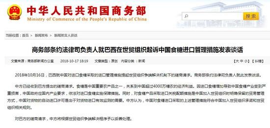 2018年10月16日,巴西就中国对进口食糖采取的进口管理措施提起世贸组织争端解决机制下的磋商请求。商务部条约法律司负责人就此发表谈话。