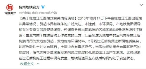 中新网10月17日电 10月17日15时许,杭州复兴大桥东侧的钱塘江水面出现疑似“漩涡”,引发广泛关注。杭州市地铁集团公司今日晚间发布情况说明称,异常江面泡沫为地层中的沼气夹带施工盾构润滑用的环保材料发泡剂引起,当盾构掘进至含有囊状沼气的地层时,沼气夹带少量润滑发泡剂通过地层的孔隙溢出江面产生泡沫。