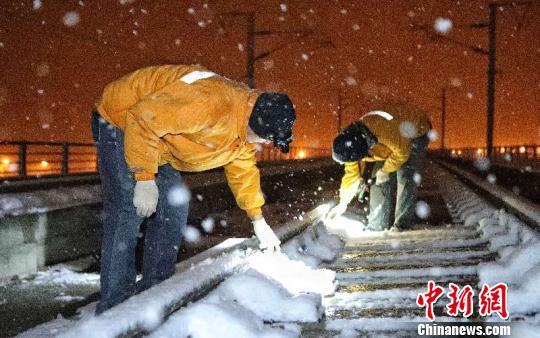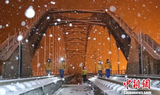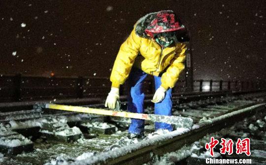面对持续降雪,新疆铁路部门组织工作人员对线路设备进行24小时现场监控。