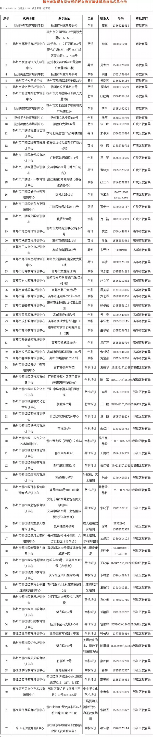 扬州市取得办学许可的民办教育培训机构
