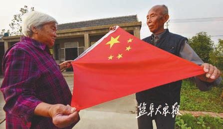 每天清晨,九旬老人肖义良和老伴一道在家门口升国旗。王金成 摄